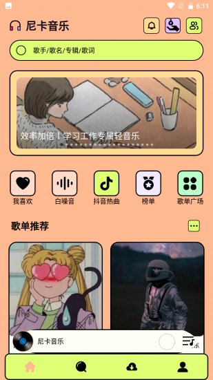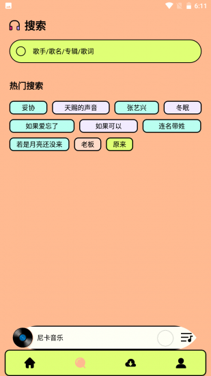 1、尼卡音乐app官方版自带搜索功能,使用搜索栏对歌曲进行搜索,也可以使用推荐栏进行寻找歌曲。