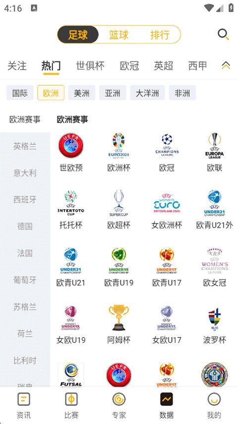 5.查阅全面数据: 数据页汇集了世界各地的体育赛事数据,内容丰富全面,无论你想了解哪项赛事的数据,都能在这里找到。
