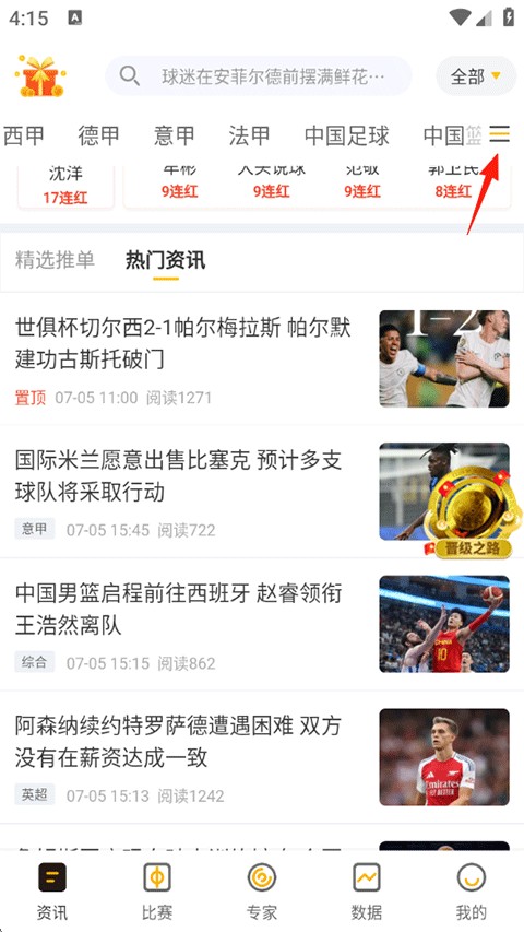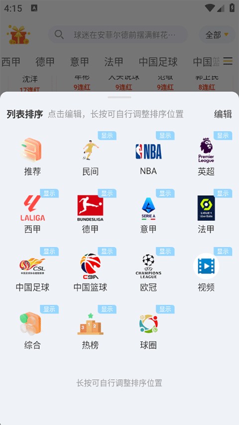 2.个性化编辑首页: 点击右上角的三线横杠图标,你可以自由编辑和排序首页的赛事标签,让首页内容更符合你的兴趣。