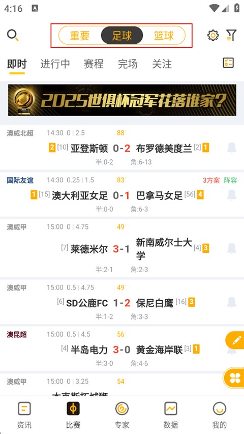 比分数据实时同步,延迟极低,确保用户能够及时获取比赛最新动态。