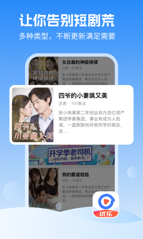 2.优乐视频拥有海量的视频资源,用户可以在软件中浏览各种类型的视频,满足不同用户的需求。