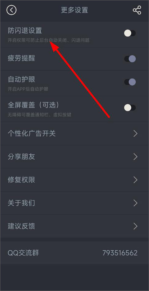 点击“更多”按钮,进入更多设置页面。在这里,你可以开启或关闭权限设置、防闪退、疲劳提醒、自动护眼以及全屏覆盖等高级功能。