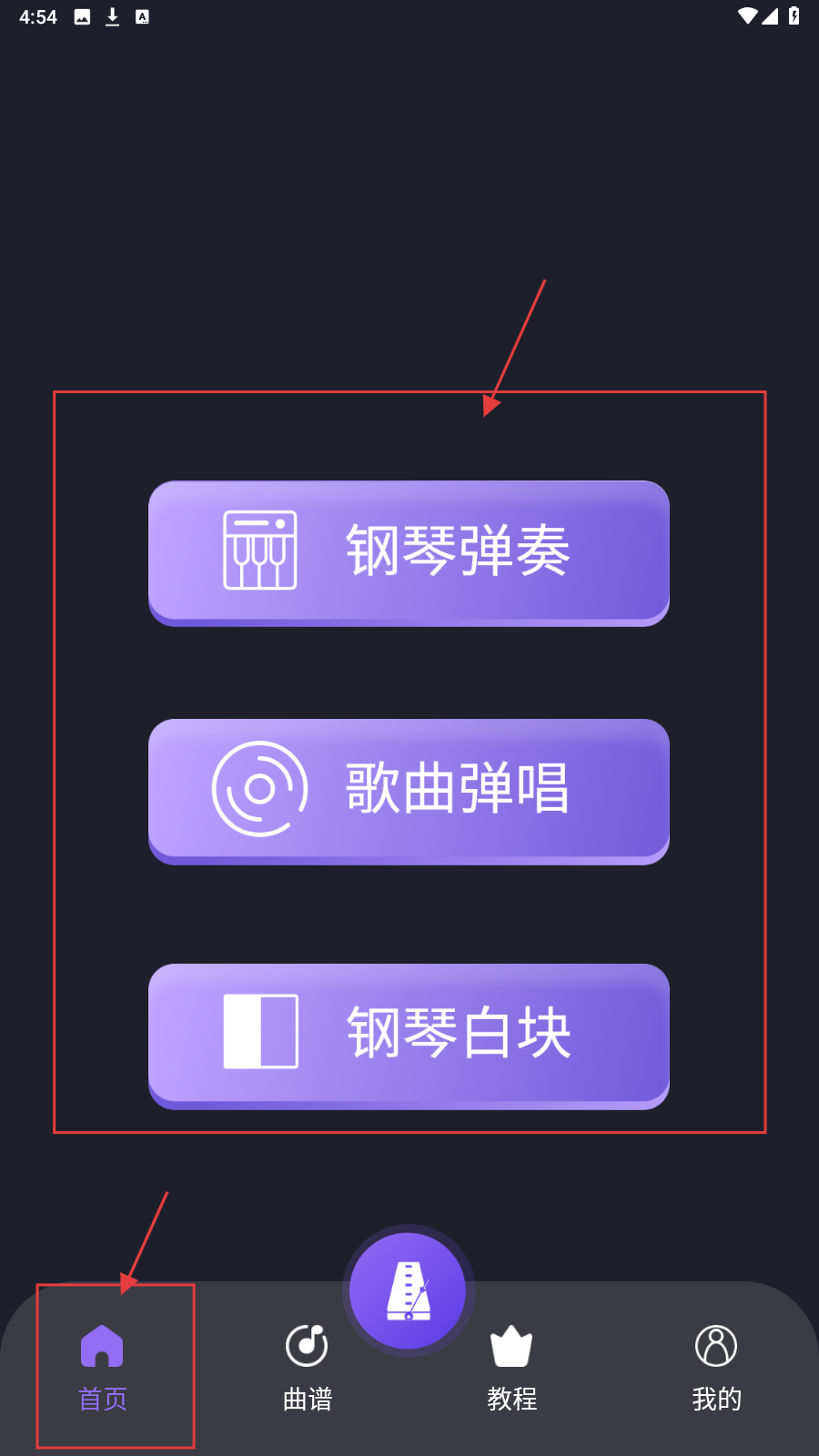 1、打开APP,进入【首页】,这里有【钢琴弹奏】【歌曲弹唱】【钢琴白块】三个功能选项。