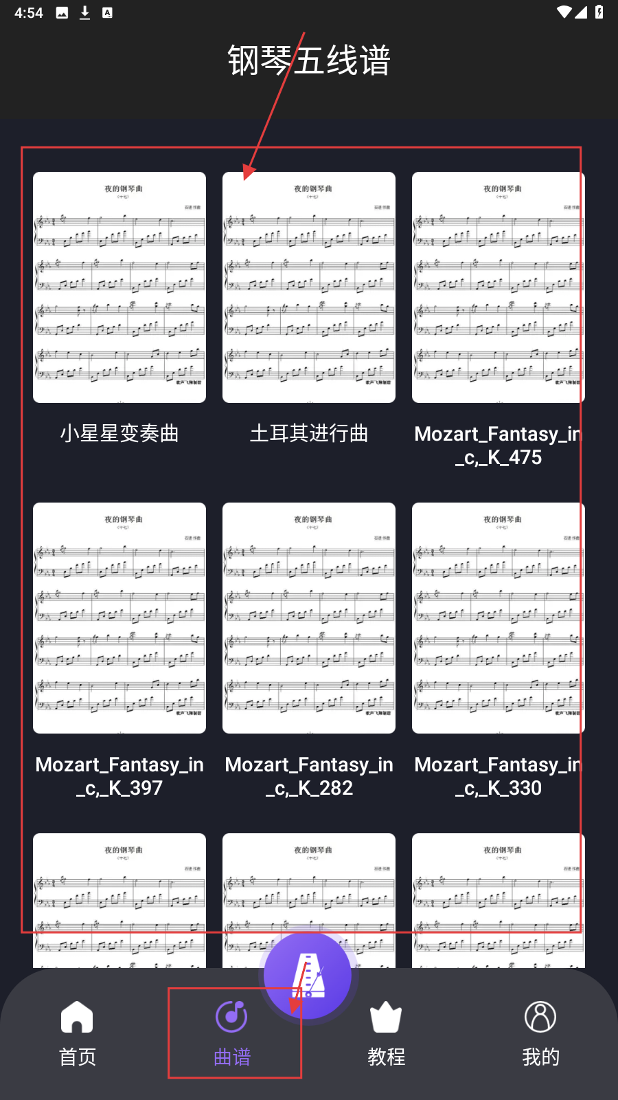3、点击底部【曲谱】,进入钢琴五线谱页面,这里有《小星星变奏曲》《土耳其进行曲》等多种曲谱。
