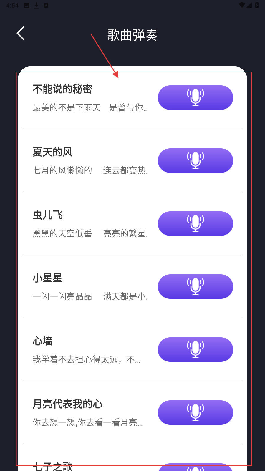 2、点击【歌曲弹唱】,进入歌曲列表页面,这里有《不能说的秘密》《夏天的风》等众多歌曲,点击歌曲右侧麦克风图标可进行弹唱。
