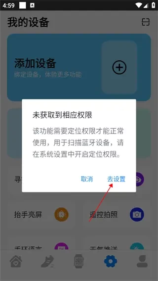 4.设置权限: 点击添加设备后,APP可能会弹出一个窗口,要求你去设置相关权限。按照提示,去设置中开启所需的权限,以确保APP能够正常搜索和连接设备。