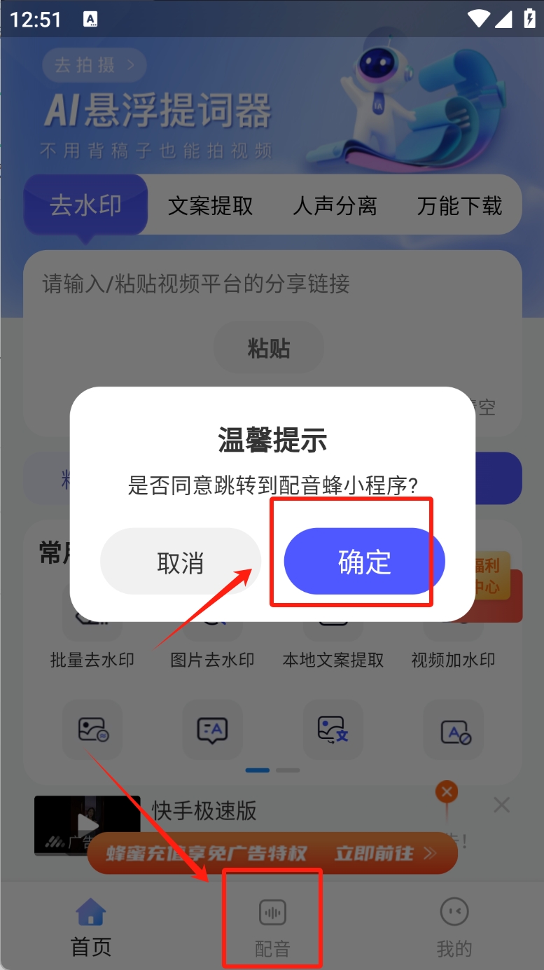 2、在去水印界面,点击“确定”按钮,同意跳转到配音蜂小程序。
