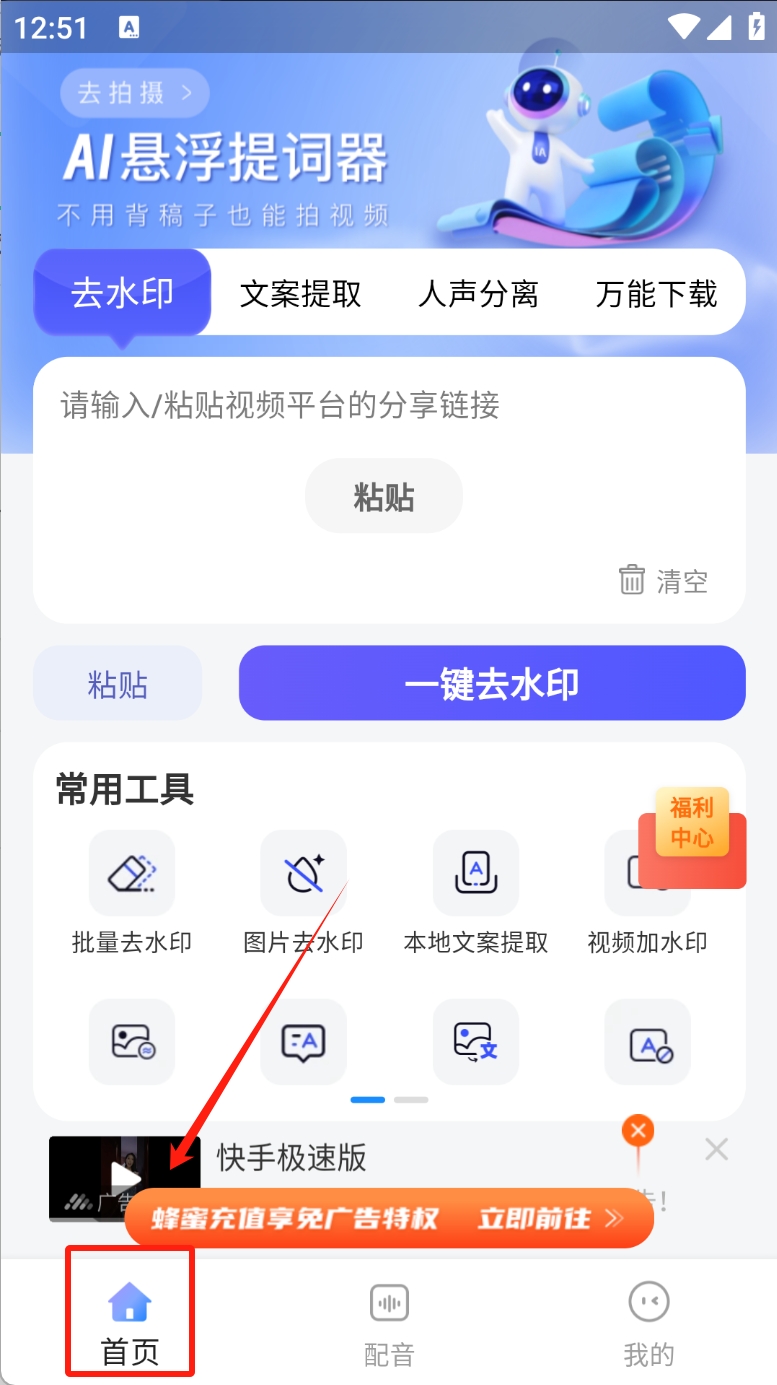 1、在首页点击“首页”按钮,进入主界面,选择“去水印”功能。