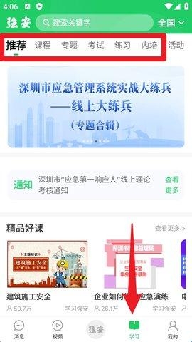 4. 点击底部的「学习」按钮,可以查看推荐课程、专题、考试等内容模块,适合日常培训与知识提升。