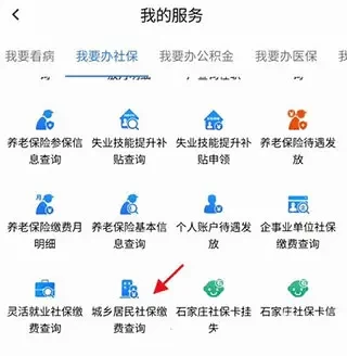 在我的服务中,寻找“我要办社保”板块,然后找到并点击“城乡居民社保缴费查询”。