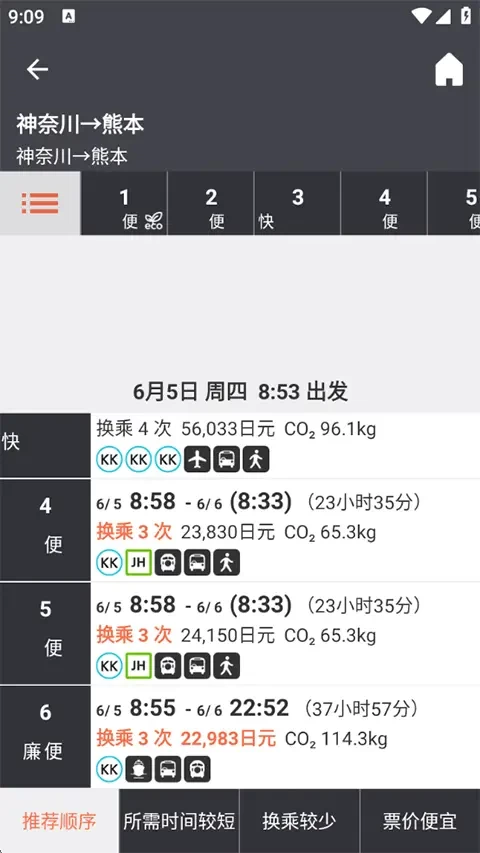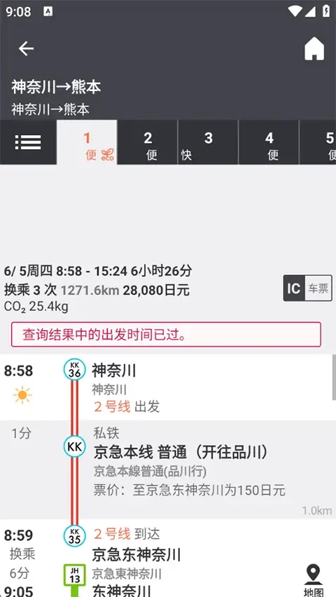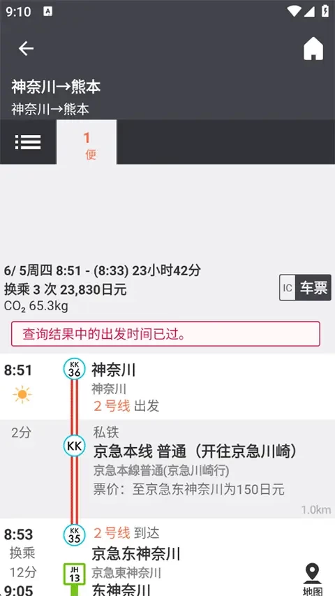 应用会显示每条路线的总费用。在日本,地铁的起步价大约是240日元,巴士是230日元。你可以根据这些信息来预算你的交通费用。