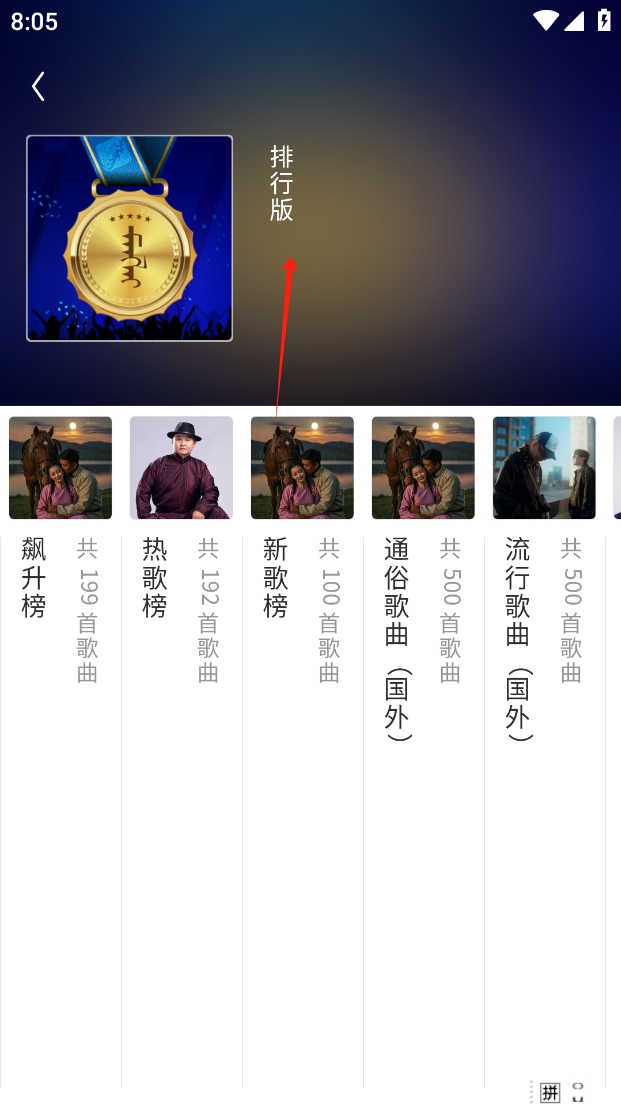2、在“排行”页面,点击“排行版”查看不同榜单的歌曲排名。