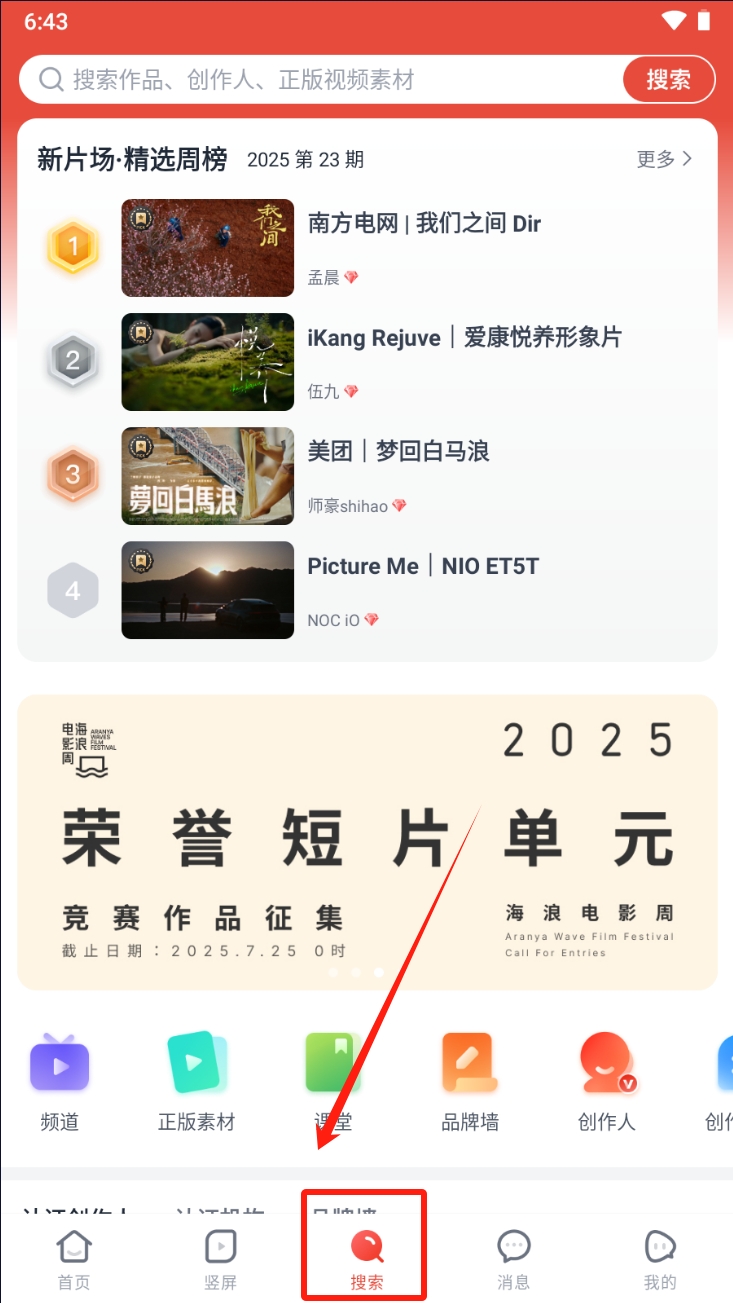 2、在搜索页面输入关键词,点击“搜索”查找特定内容或创作者。