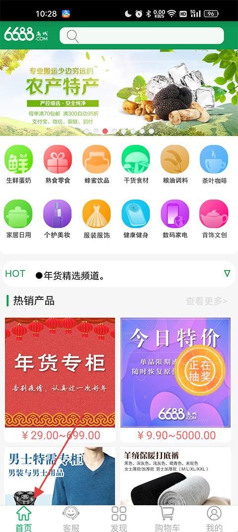 1、商城首页展示多样分类,涵盖生鲜蛋奶、熟食零食等,还有年货精选、今日特价等促销板块,方便选购。