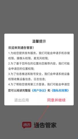 1、打开通告管家,会弹出温馨提示,告知可能申请的手机存储、摄像头等权限,点击同意并继续可进入。