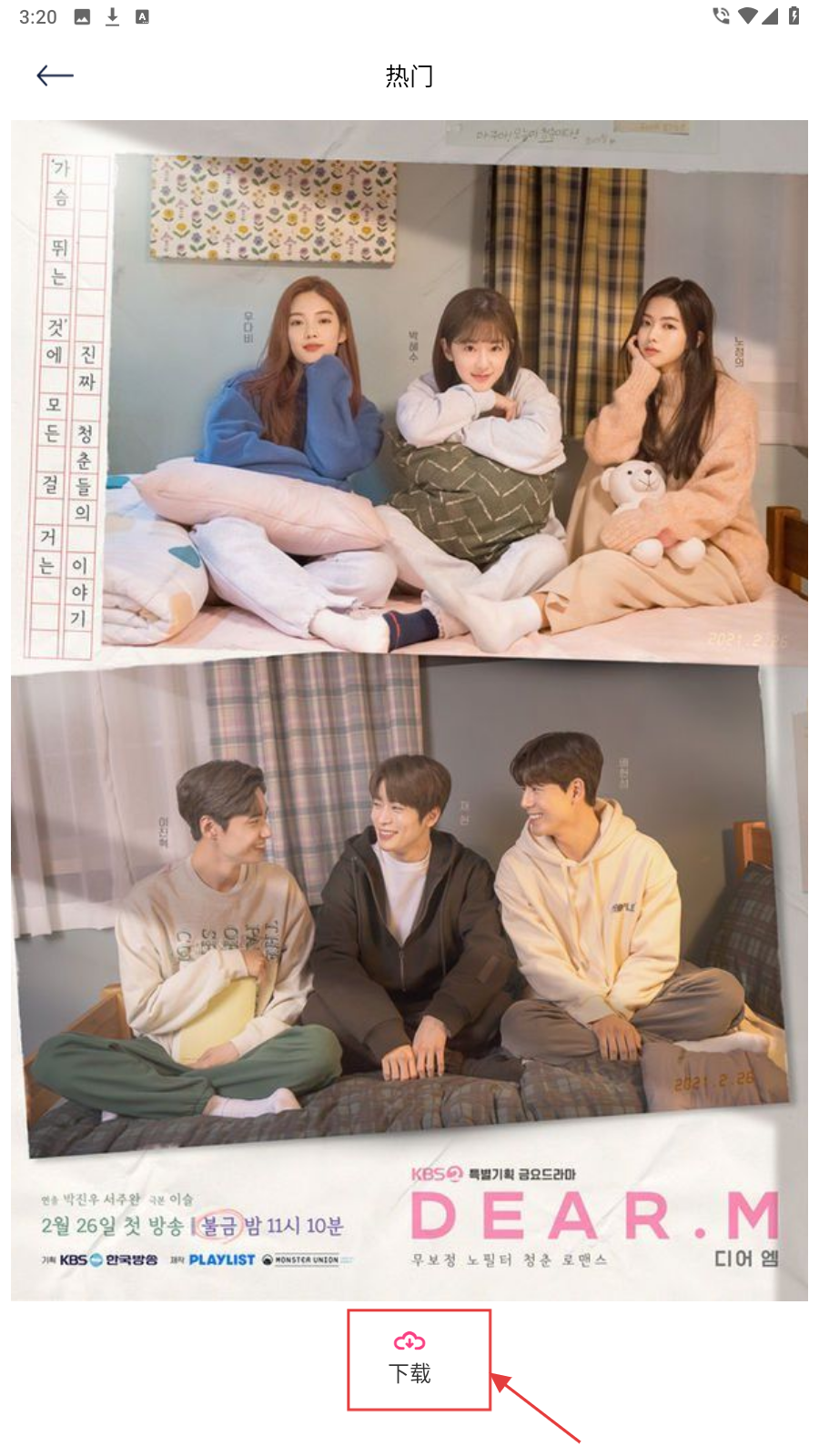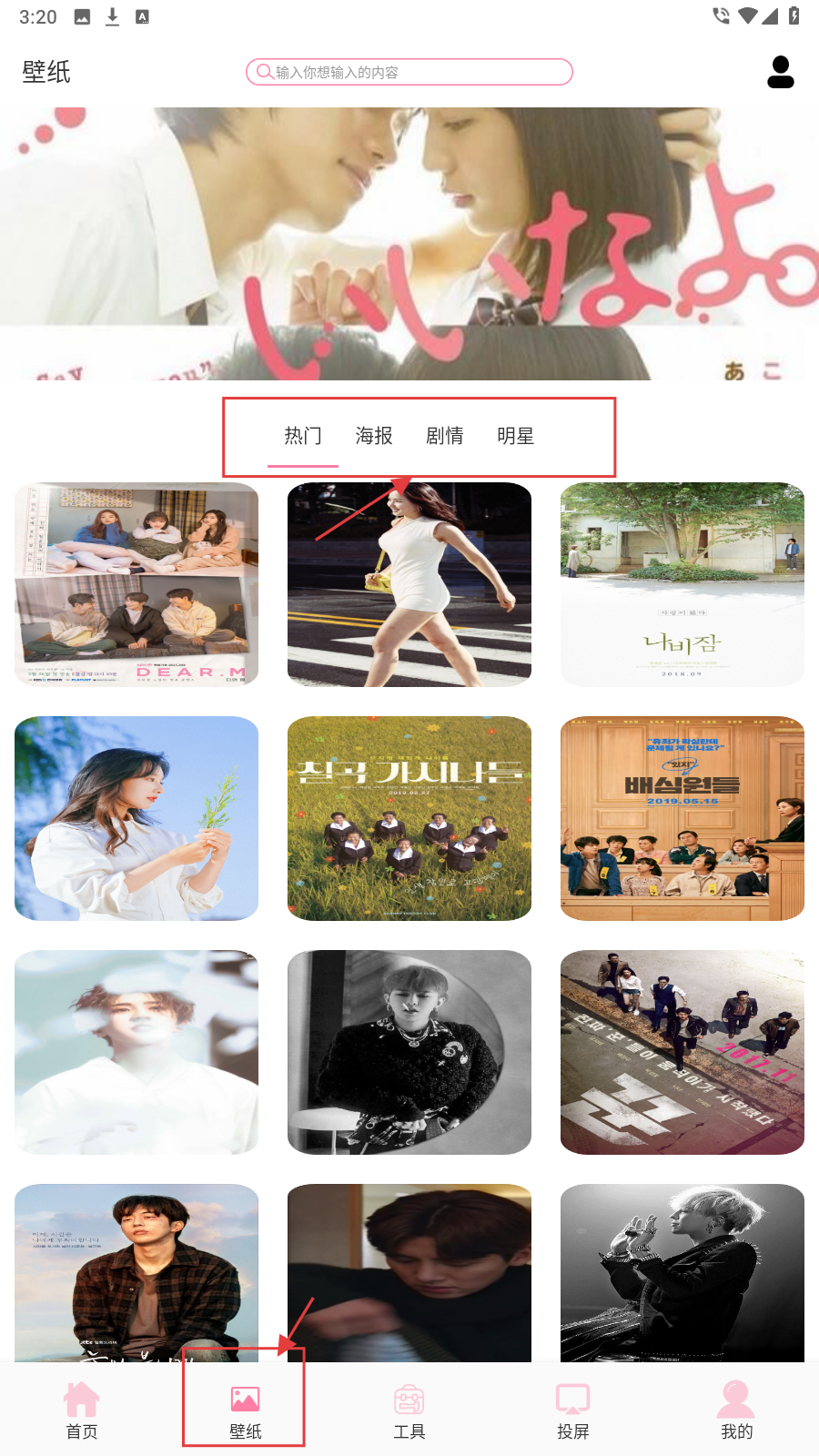 3、在应用底部导航栏点击【壁纸】,进入壁纸页面,可通过热门、海报等分类标签,筛选出喜欢的韩剧壁纸。