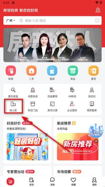 1、下载并打开邦邻找房app,点击“找小区”。