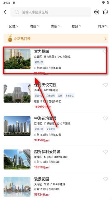 2、点击后,即可查看到非常多的小区信息,点击你钟意的小区信息。