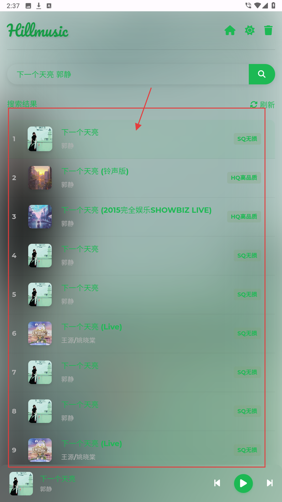 3、搜索结果页面会展示相关歌曲列表,可浏览并选择想要聆听的歌曲。