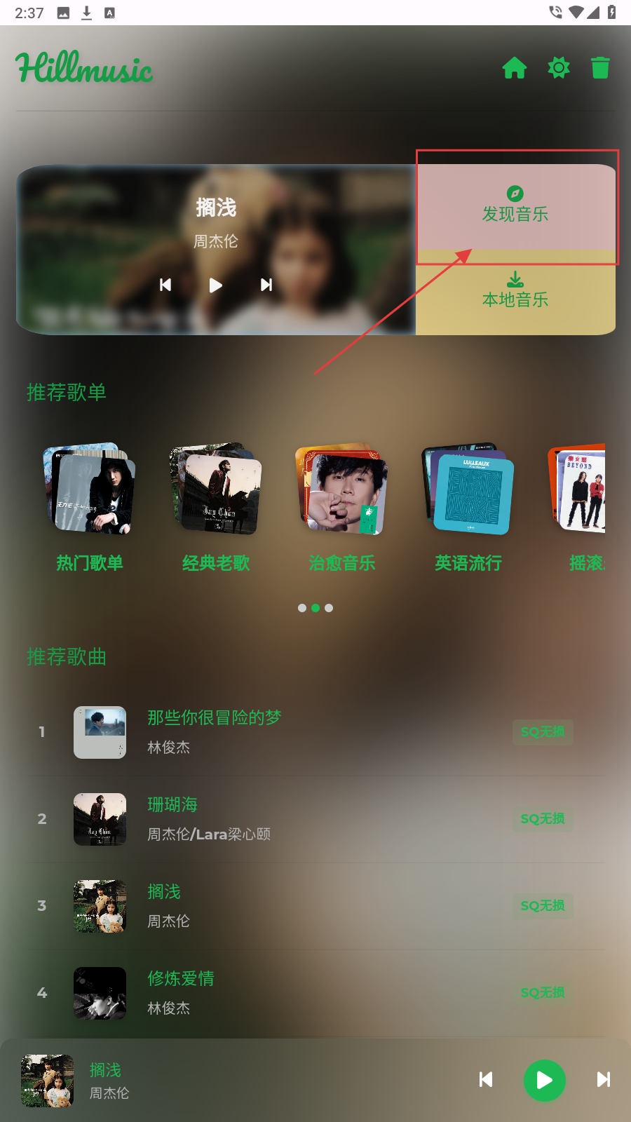 1、打开应用,在首页点击【发现音乐】,进入音乐发现页面,开启音乐探索之旅。
