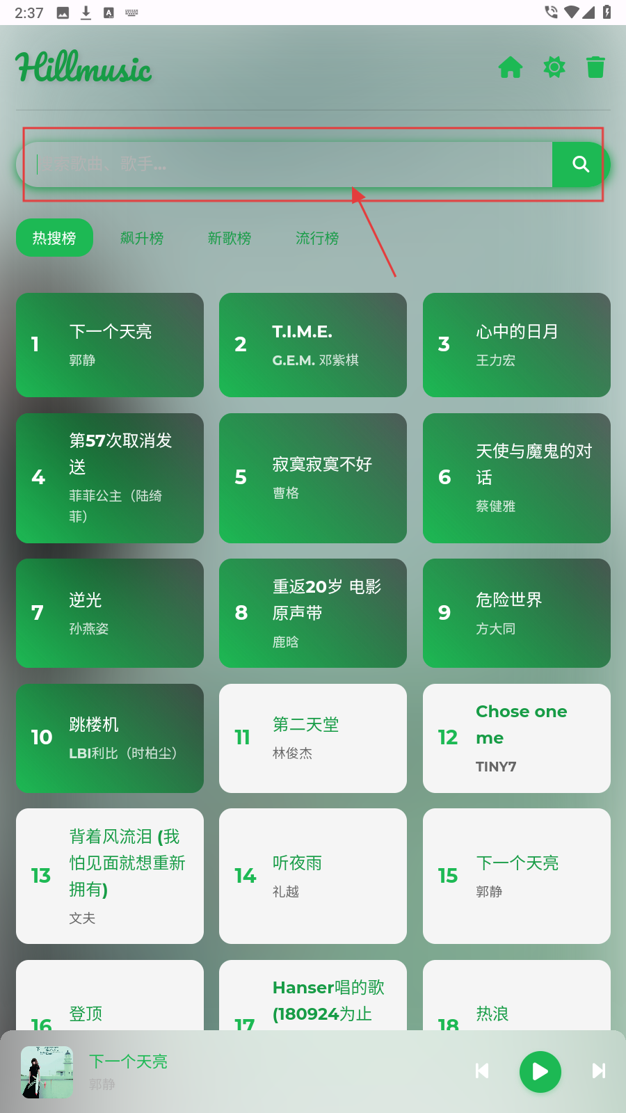 2、在音乐发现页面,利用顶部搜索栏,可输入歌曲名、歌手名等关键词搜索心仪音乐。