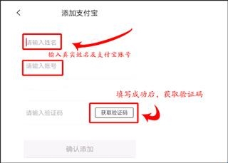 4、填写真实姓名及支付宝账号,并获取验证码,务必要填写正确