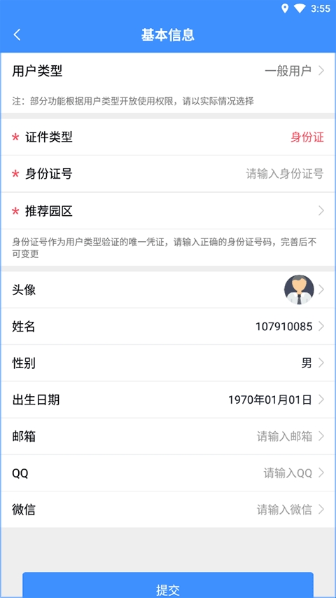2、点击“我的”页面点击“基本信息”,完善个人信息(身份证号、姓名、性别、邮箱为必填项)。