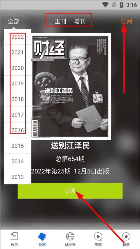 2、进入杂志页面后,可以看到订阅分为正刊和增刊,可以点击左上角全部,选择年份订阅,也可订阅当前最新一期,点击订阅进入下一步;