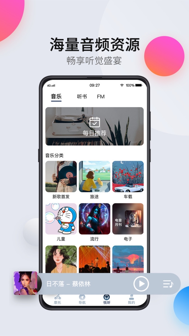 2、悦听畅享听觉盛宴,可同步酷狗音乐、听书、无线广播FM应有尽有,多资源融合,选择性更多。