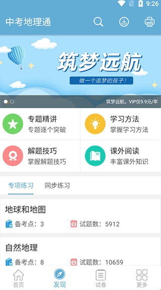 2、在发现页面,同学们可以在这里对地理知识进行专项练习和同步练习,可以在这里查看解题技巧、学习方法和课外阅读等相关内容;