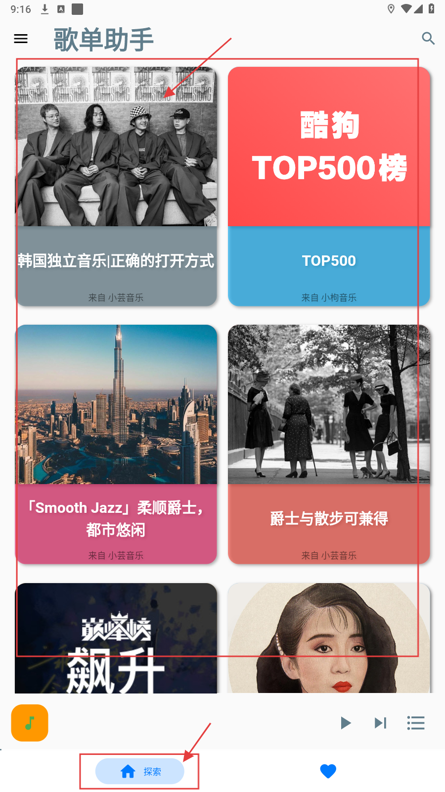 1、打开应用,在【探索】页面选择心仪的歌单并点击进入。