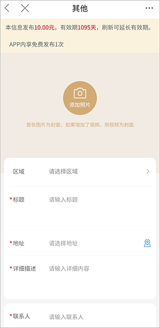 3、最后,选择区域,标题、地址、输入您的招聘内容,滑到最下方点击“0元发布”即可。