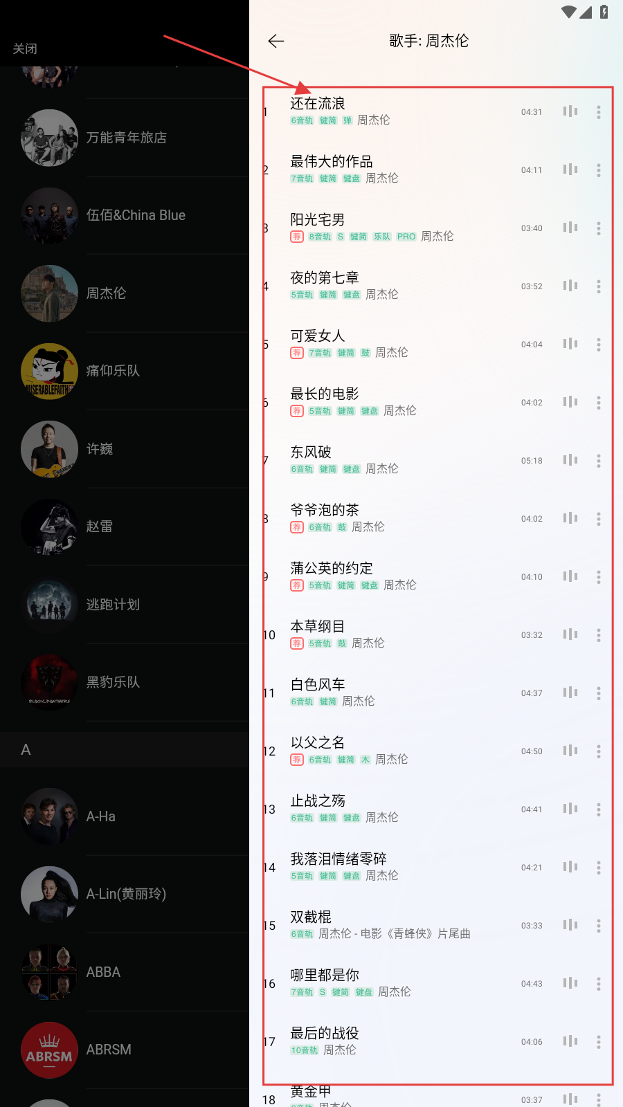 4、选择歌手,如【周杰伦】后,可查看其包含【还在流浪】等歌曲的列表,点击可播放。