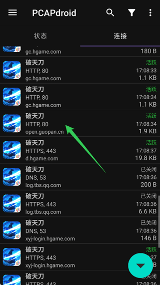 当PCAPdroid显示为就绪状态时,点击“开始”按钮即可启动抓包。随后,在连接页面,你可以实时查看所有的网络连接。