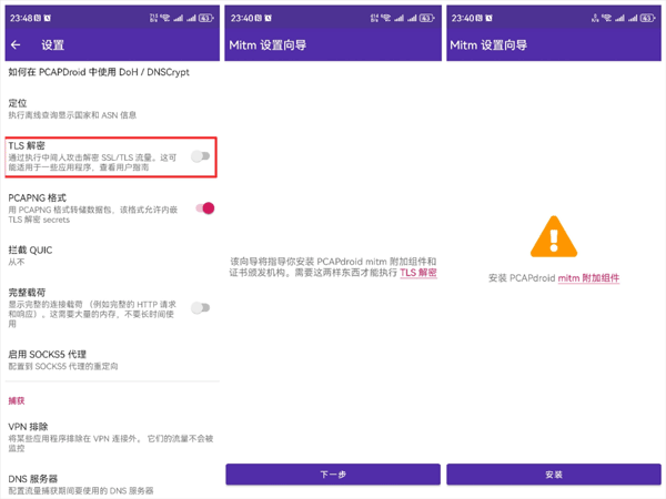 在设置页面勾选TLS解密,并按照提示安装PCAPdroid-mitm附加组件。