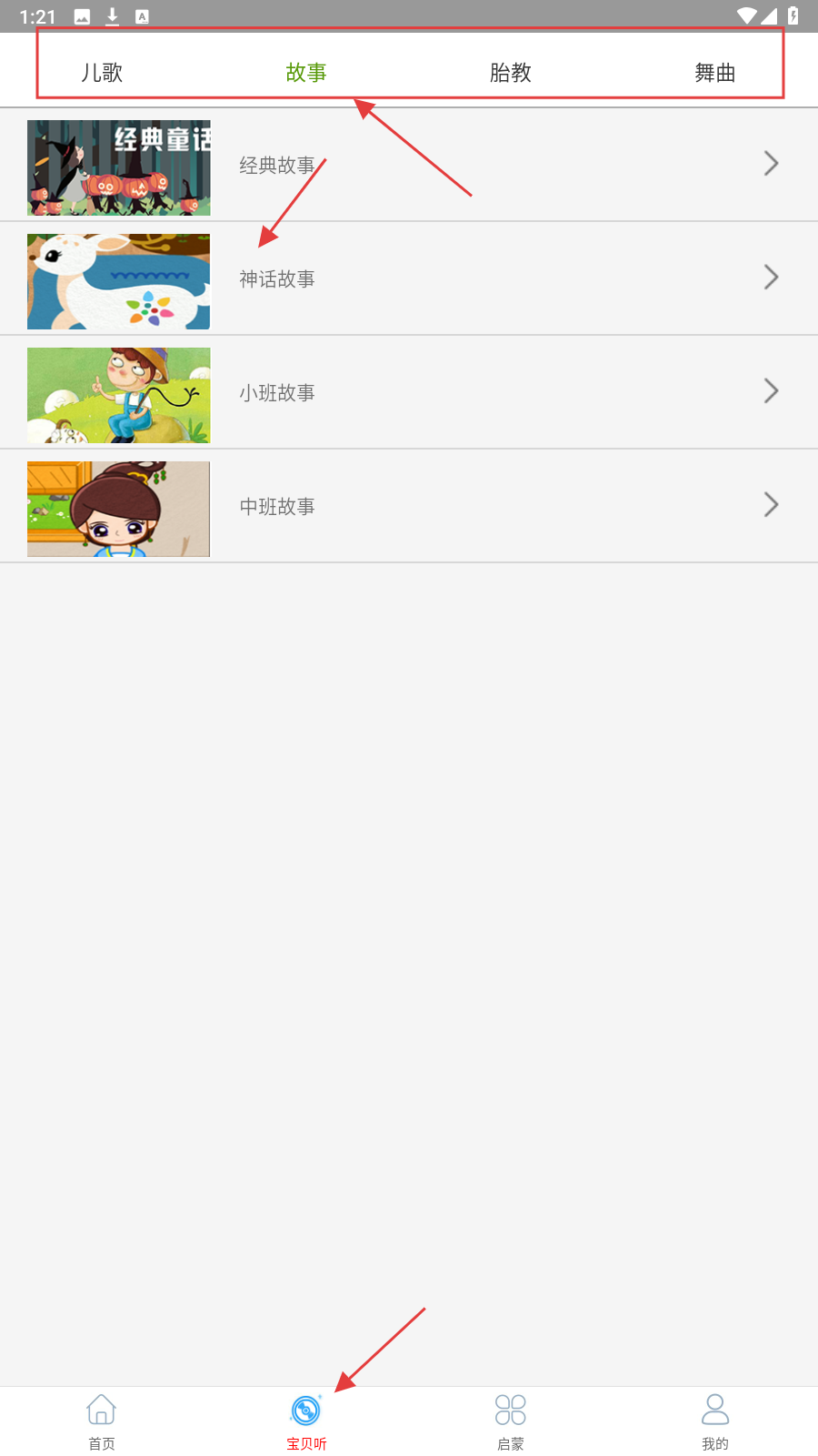 1、打开应用后,选择故事分类下的子分类,如【经典故事】,点击进入故事列表页面。