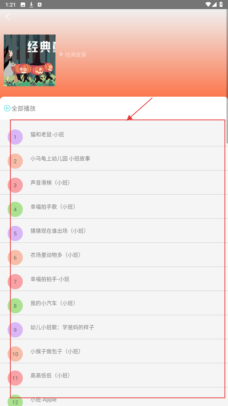 2、在故事列表页面,可选择喜欢的故事,如【小乌龟上幼儿园-小班故事】,点击进入播放页面。
