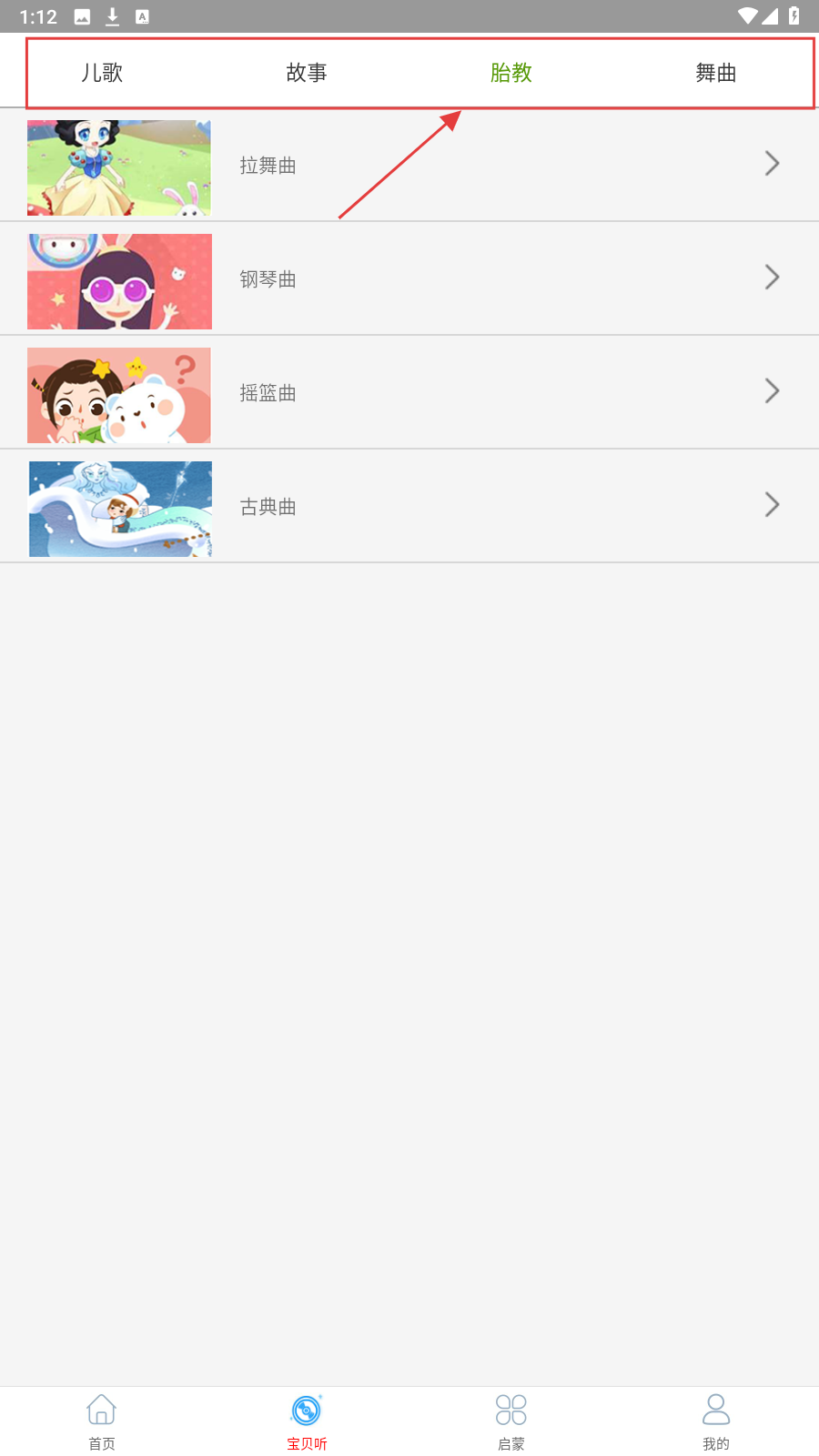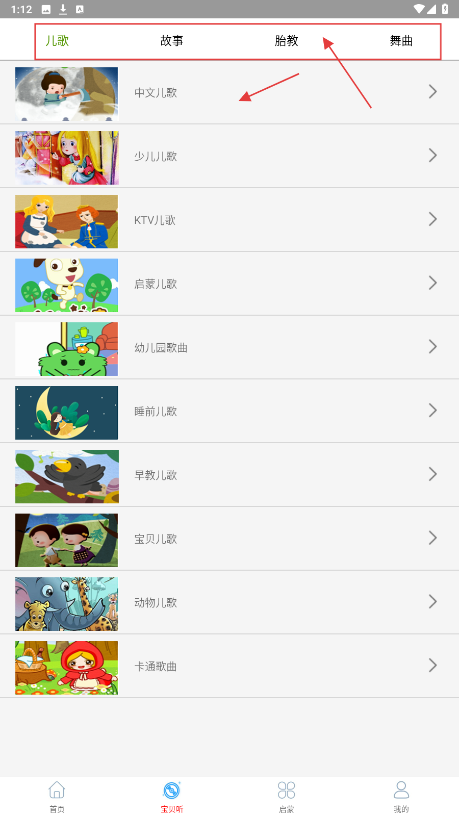 1、打开应用后,在宝贝听页面选择儿歌分类下的子分类,如【中文儿歌】,点击进入儿歌列表页面。
