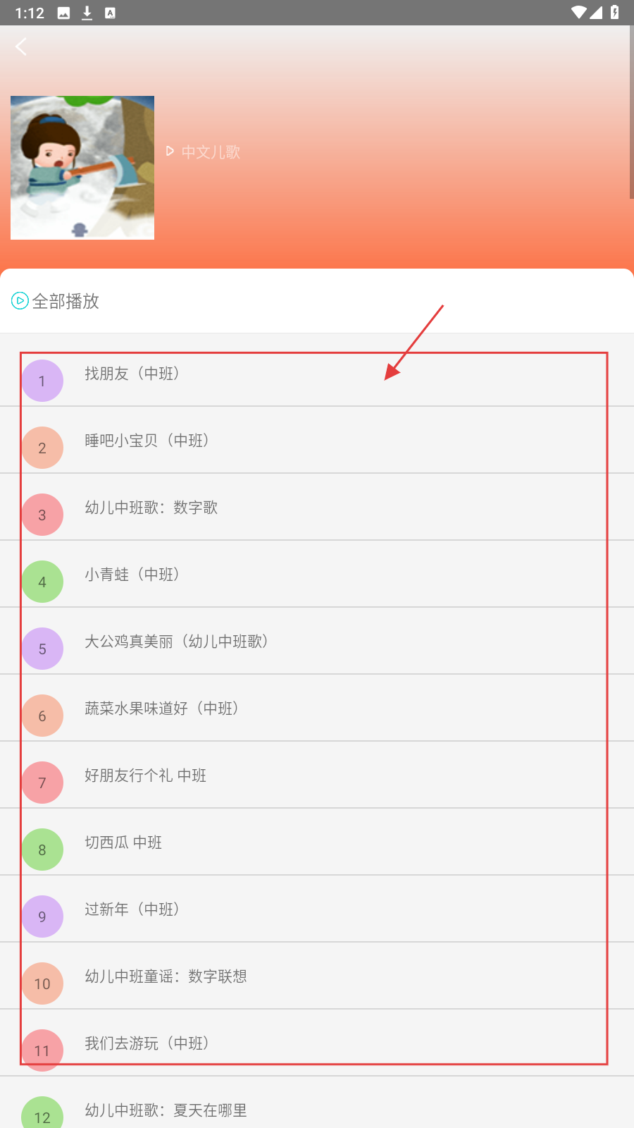 2、在儿歌列表页面,可选择喜欢的儿歌,如【小青蛙(中班)】,点击进入播放页面。