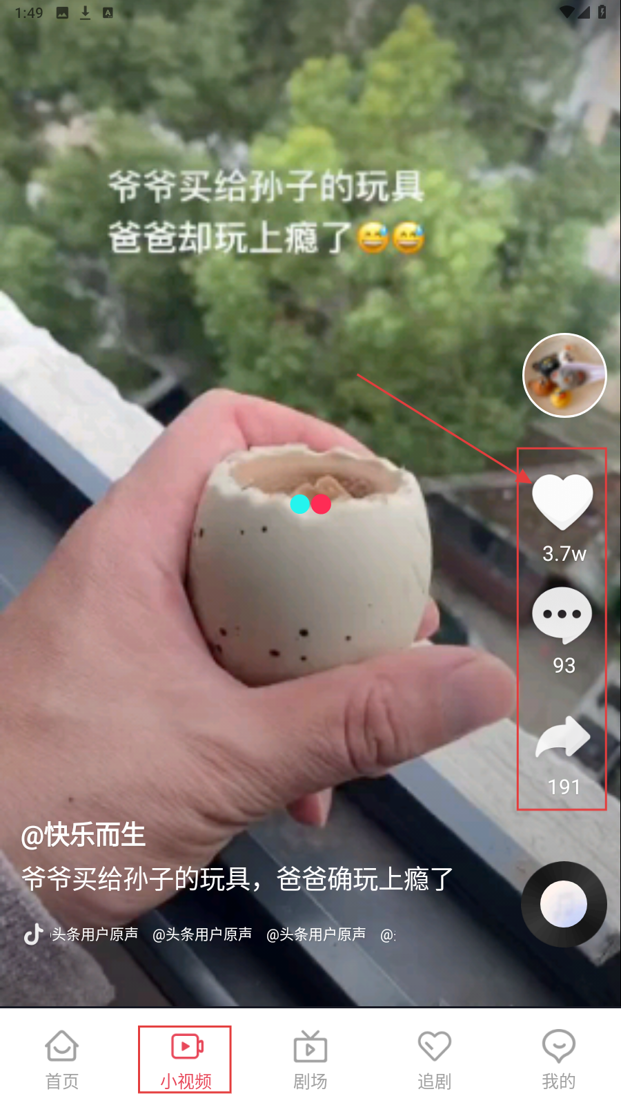 4、切换到【小视频】页面,可浏览各种小视频内容,遇到喜欢的视频可点击右侧的点赞、评论、分享按钮与其他用户互动。