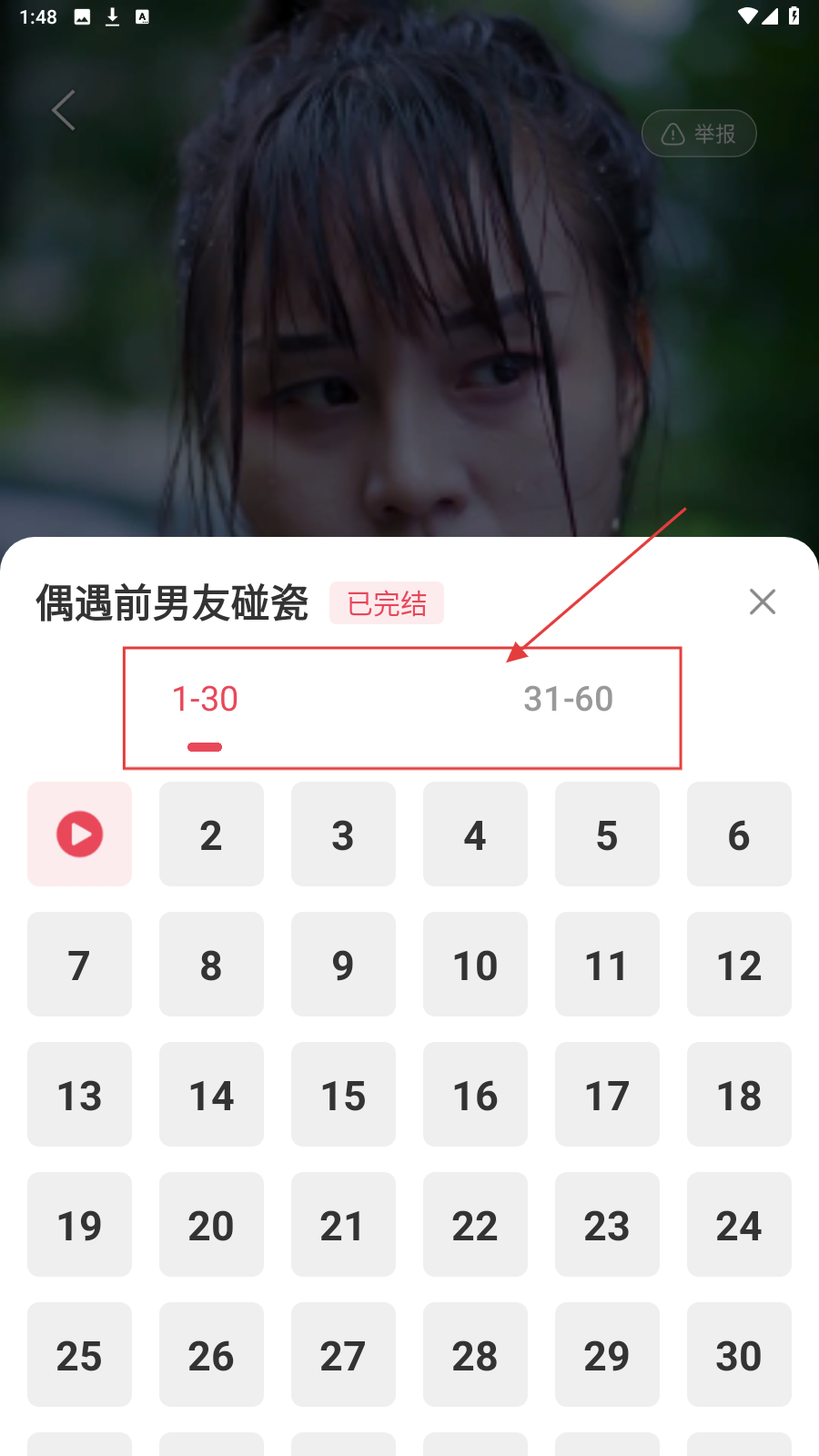 3、在剧集集数选择页面,可根据自己的观看进度选择对应的集数范围,如1-30集或31-60集,继续观看剧集。