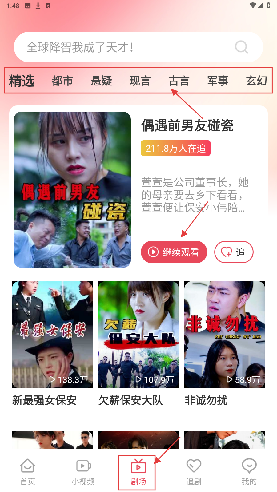 1、打开应用后,在剧场页面选择喜欢的剧集分类,如【古言】,找到感兴趣的剧集,点击【继续观看】开始播放。