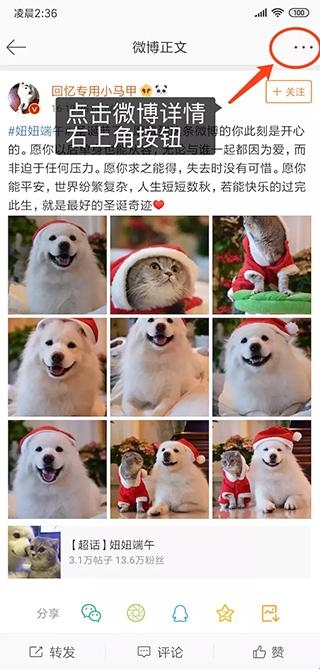 1、这里以微博为例,其他平台类似,均为“复制链接”下载。在微博详情中,点击右上角按钮。