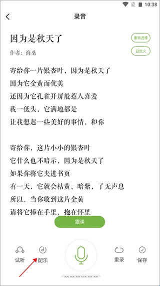 3、接着在朗读界面,点击左下方的“配乐”,即可自由选择你想要的配乐啦。