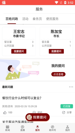 4、在服务页面,用户可以百姓问政,在这里可以对市领导提问