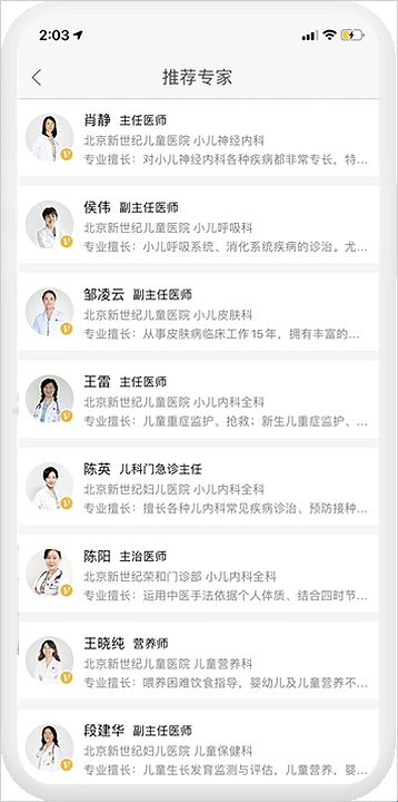 全国超1000权威儿科主任专家实时在线,快速解答用户的问题,支持图文、语音等形式。细分30多个儿童科室,满足用户需求:儿童保健科、小儿内科全科、小儿外科全科、小儿呼吸科、小儿神经内科、小儿心脏内科、新生儿中心、小儿血液科、小儿耳鼻喉科、小儿口腔科、口腔面额整形创伤科、小儿皮肤科、小儿眼科、小儿中医科、小儿妇科、小儿骨科、小儿营养科、小儿心血管外科、小儿内分泌科、小儿变态反应学科、儿童风湿免疫科、小儿泌尿外科、小儿推拿科、小儿心理门诊等。