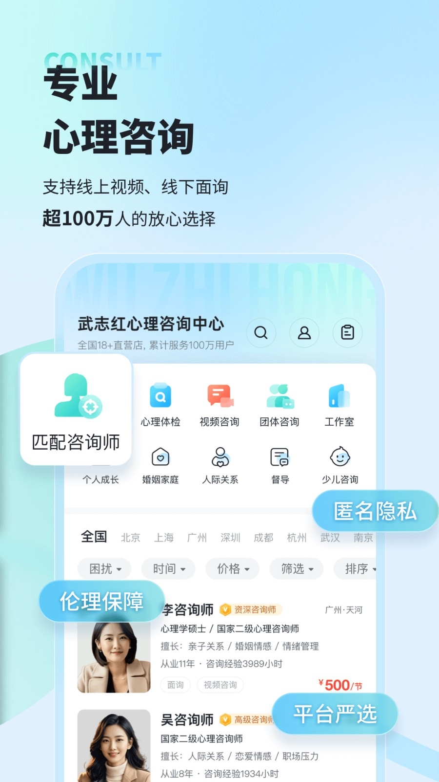 层层严选,邀请武志红等100+位拥有专业受训背景的资深心理咨询师入驻平台。