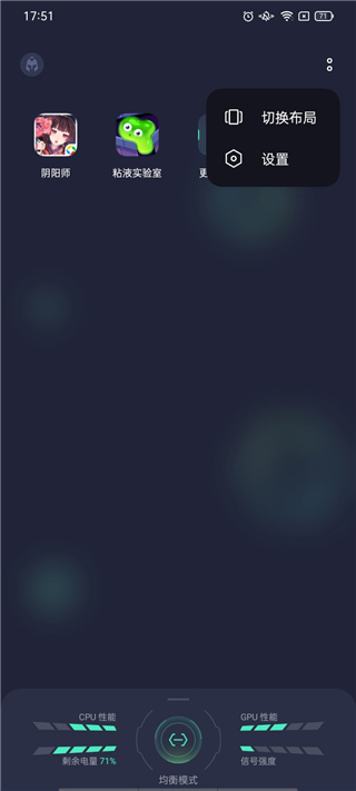 5.性能监控:在应用主界面的右上角,你可以切换软件布局,并查看游戏的CPU性能、GPU性能以及信号强度等详细信息。