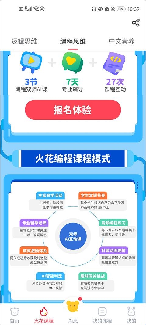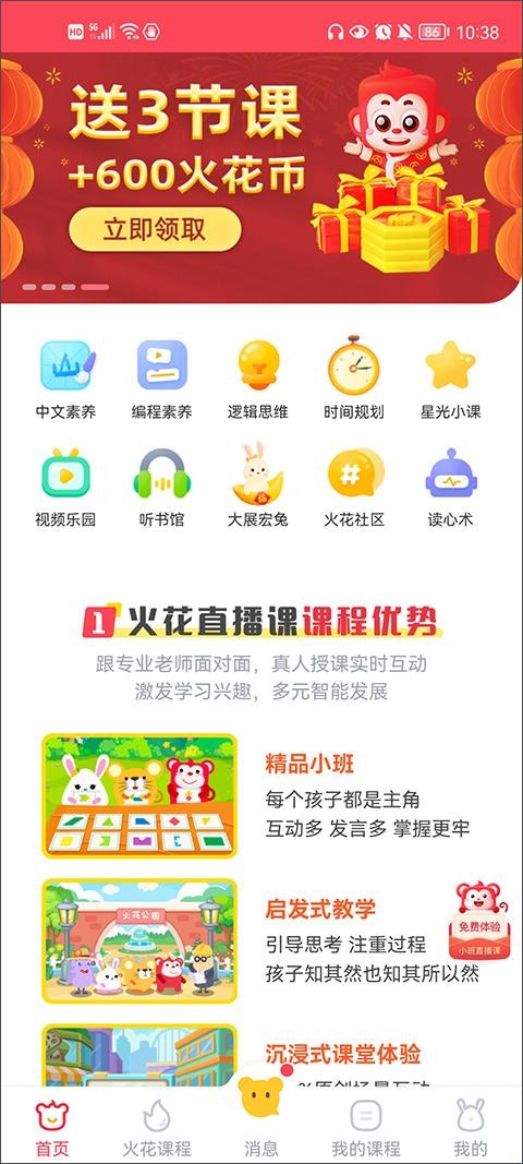 1、在软件首页不仅提供了火花直播课堂之外,还提供你了中文素养、编程素养、逻辑思维、时间规划等学习课程。