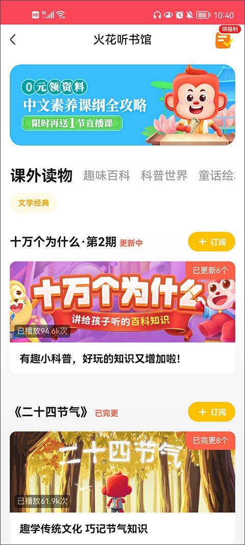 3、另外还提供了火花听书馆,为孩子们普及更多有趣的百科知识。